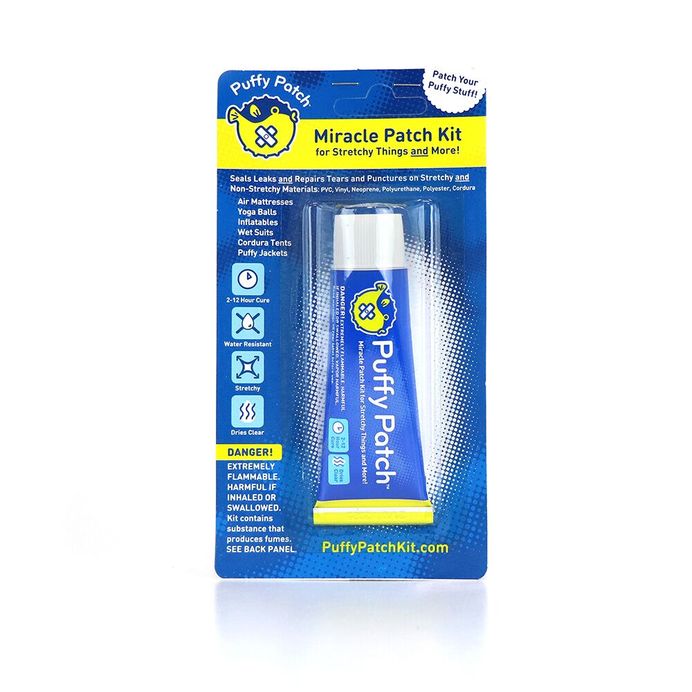 Puffy Patch Kit is a waterproof repair adhesive developed to permanently mend tears and seal leaks in various materials such as PVC, vinyl, neoprene, polyester, Cordura, and waterproof fabrics.